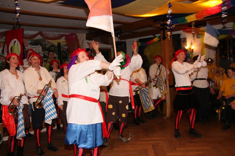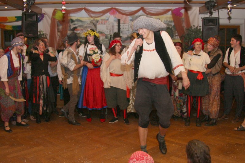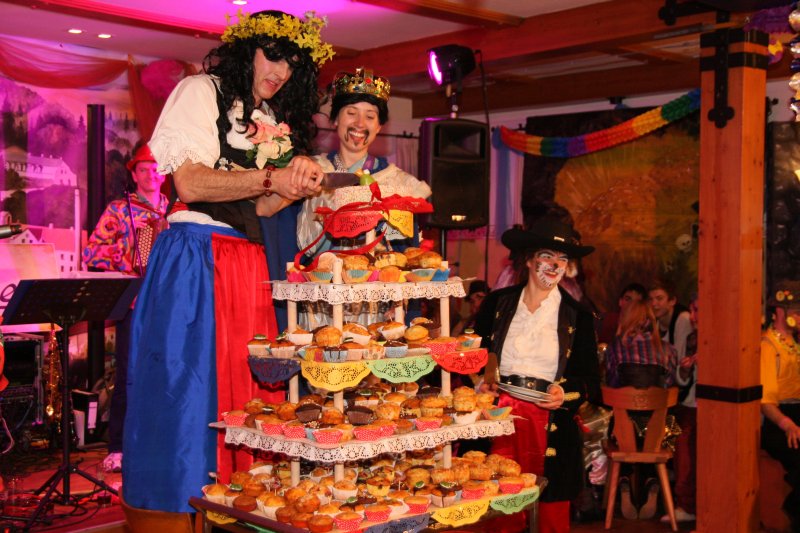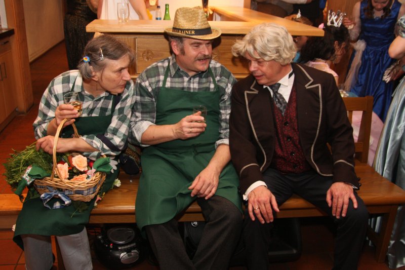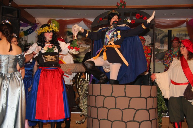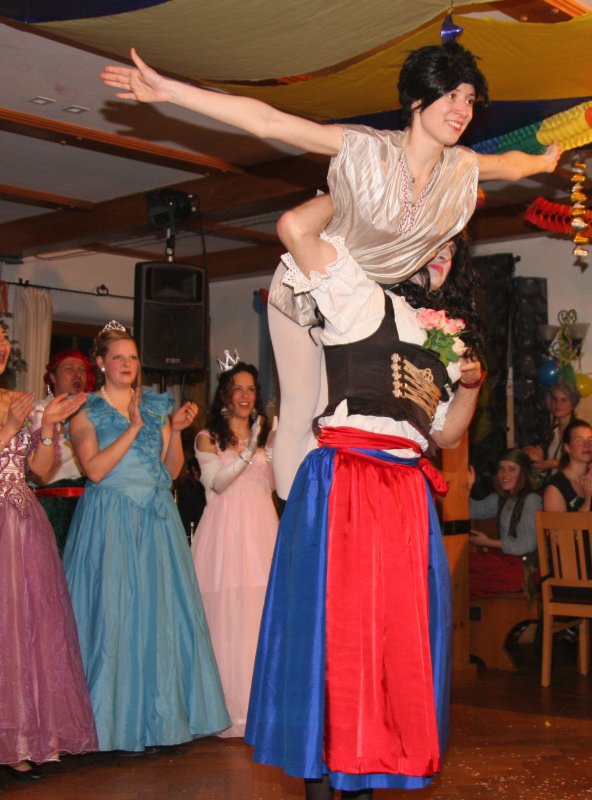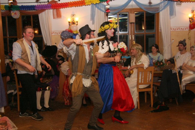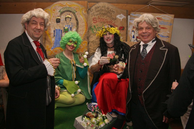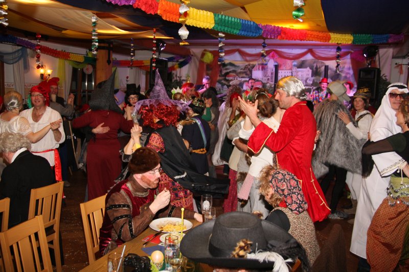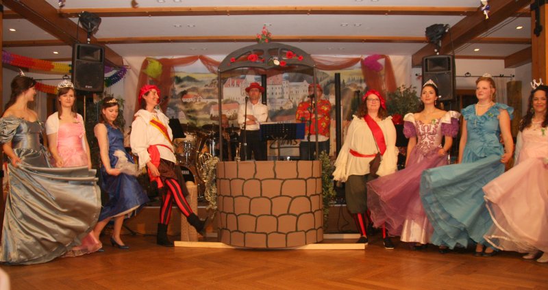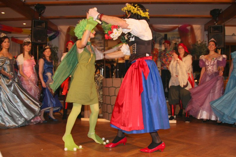 Der Fanfarenzug führte die Gesellschaft dann in den Saal, wo "Richard Wagner" sie auf die Plätze verteilte und Hochzeitssträußchen für die Gäste verteilt wurden. Nach einer Tanzrunde der "Zimseer" gaben die Gebrüder Grimm eine Einführung über den Sinn ihrer in Büchern gesammelten Märchen. Nun folgte schon der erste Höhepunkt des Abends: der Einzug des Hochzeitspaares mit Hungertanz. Anscheinend gab es Unstimmigkeiten zwischen den beiden und Schlawittchen beförderte den Frosch mit einem Tritt in den Hintern in einen tiefen Brunnen. Ein Aufschrei ging durch den Saal, aber zu aller Überraschung stieg sogleich König Ludwig II erhobenen Hauptes aus dem Brunnen empor. Erleichtert über diese glückliche Wendung folgte der "Brautwalzer" mit pfiffiger Choreografie und akrobatischen Hebefiguren, die von den Besuchern mit tosendem Applaus bedacht wurden. Die Stimmung im zum Bersten vollem Saal stieg bei Musik und bei Wein, bis wieder eine Schrecksekunde die Gesellschaft erfasste. Die Braut wurde von Alibaba und den vierzig Räubern gestohlen samt weiterer dreier Frauen. Nach zähen Verhandlungen mit dem Anführer, einigen Prüfungen und einem Liebesbeweis konnten dann aber alle wieder glücklich ausgelöst werden. Es wurde noch ausgiebig getanzt, der königliche Fanfaren- und Trommelzug schwenkte seine Fahnen, das Sternentalermädchen sammelte fleißig Taler ein, und an der mobilen Bar war der Andrang groß. Gegen Mitternacht wurde die prächtige Hochzeitstorte angeschnitten und an die Besucher verteilt. Die Gäste feierten ausgelassen bis weit in die Nacht - und wenn sie nicht gestorben sind, dann feiern sie noch heute.