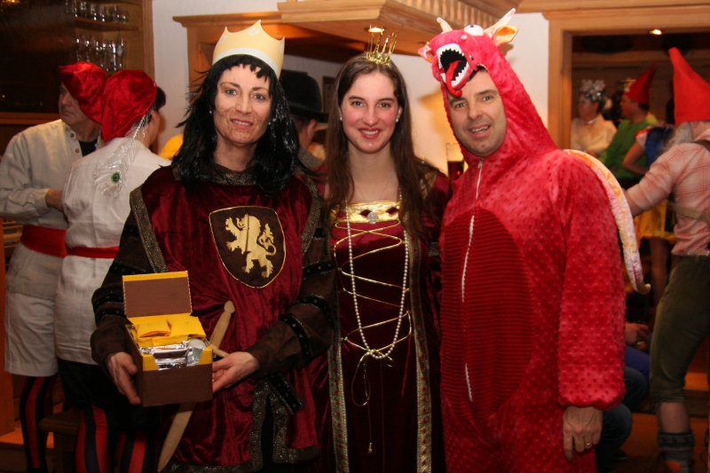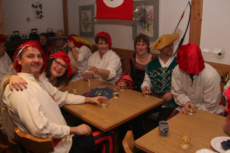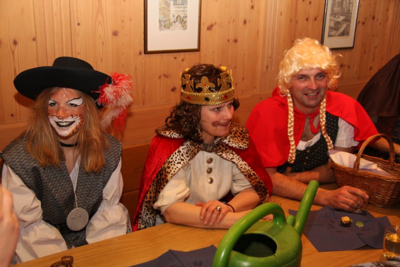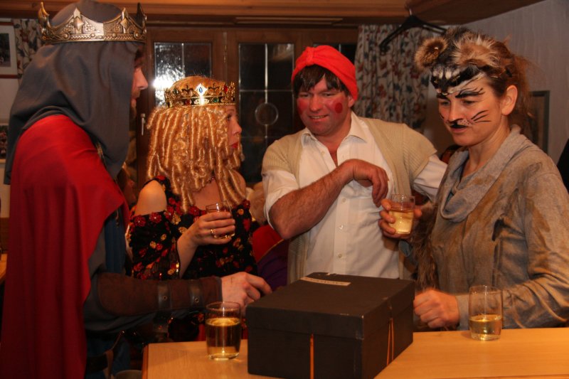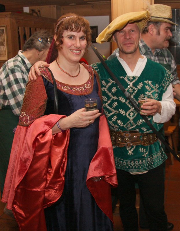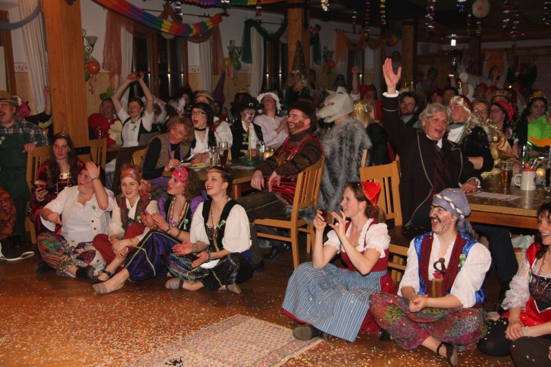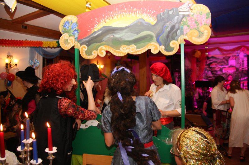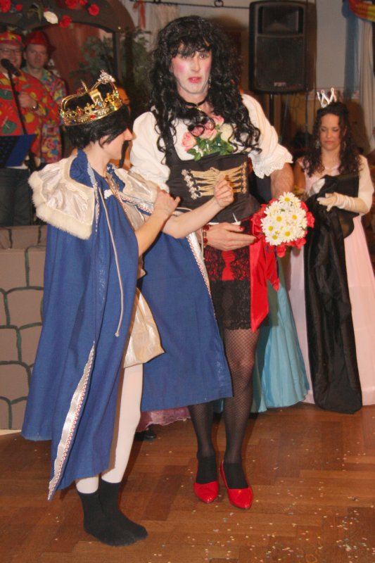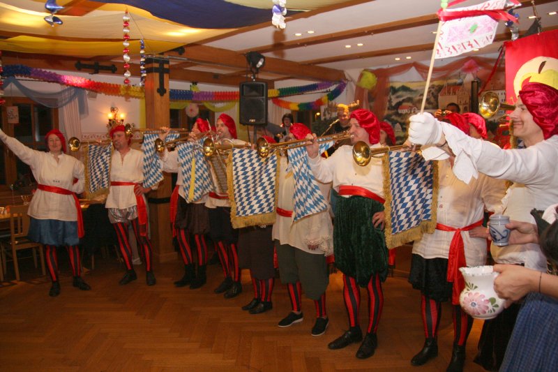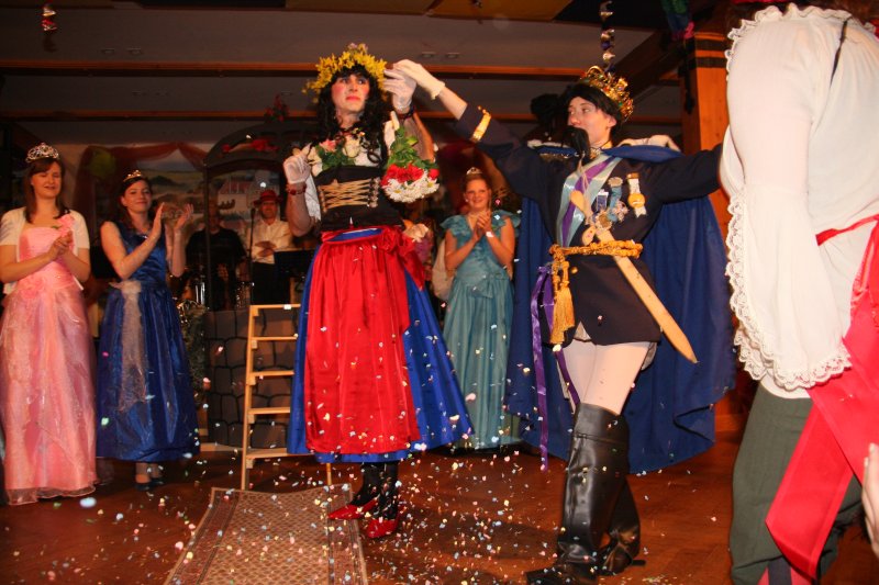 Der Fanfarenzug führte die Gesellschaft dann in den Saal, wo "Richard Wagner" sie auf die Plätze verteilte und Hochzeitssträußchen für die Gäste verteilt wurden. Nach einer Tanzrunde der "Zimseer" gaben die Gebrüder Grimm eine Einführung über den Sinn ihrer in Büchern gesammelten Märchen. Nun folgte schon der erste Höhepunkt des Abends: der Einzug des Hochzeitspaares mit Hungertanz. Anscheinend gab es Unstimmigkeiten zwischen den beiden und Schlawittchen beförderte den Frosch mit einem Tritt in den Hintern in einen tiefen Brunnen. Ein Aufschrei ging durch den Saal, aber zu aller Überraschung stieg sogleich König Ludwig II erhobenen Hauptes aus dem Brunnen empor. Erleichtert über diese glückliche Wendung folgte der "Brautwalzer" mit pfiffiger Choreografie und akrobatischen Hebefiguren, die von den Besuchern mit tosendem Applaus bedacht wurden. Die Stimmung im zum Bersten vollem Saal stieg bei Musik und bei Wein, bis wieder eine Schrecksekunde die Gesellschaft erfasste. Die Braut wurde von Alibaba und den vierzig Räubern gestohlen samt weiterer dreier Frauen. Nach zähen Verhandlungen mit dem Anführer, einigen Prüfungen und einem Liebesbeweis konnten dann aber alle wieder glücklich ausgelöst werden. Es wurde noch ausgiebig getanzt, der königliche Fanfaren- und Trommelzug schwenkte seine Fahnen, das Sternentalermädchen sammelte fleißig Taler ein, und an der mobilen Bar war der Andrang groß. Gegen Mitternacht wurde die prächtige Hochzeitstorte angeschnitten und an die Besucher verteilt. Die Gäste feierten ausgelassen bis weit in die Nacht - und wenn sie nicht gestorben sind, dann feiern sie noch heute.