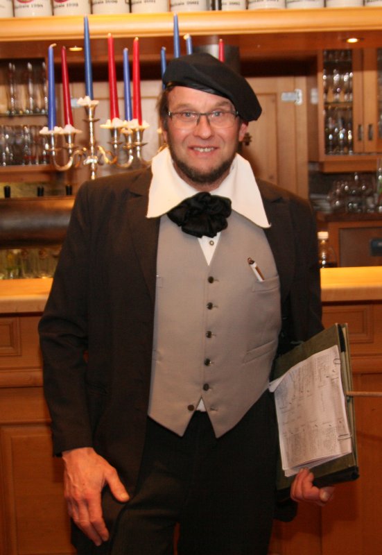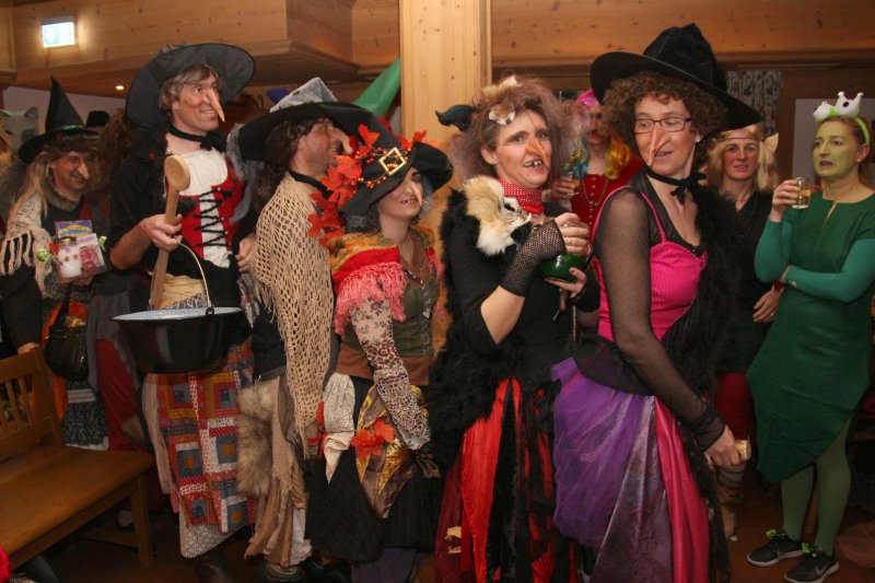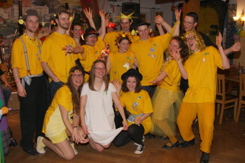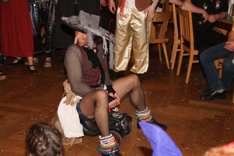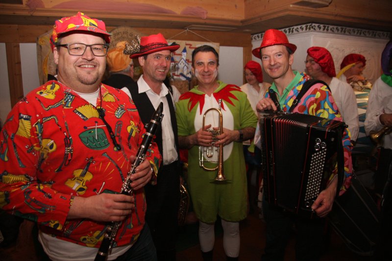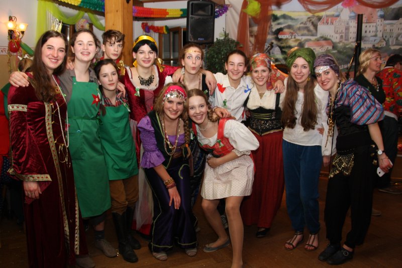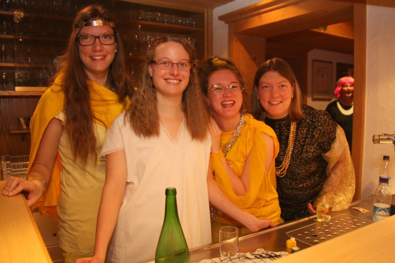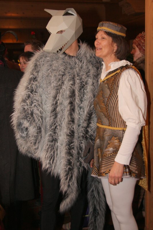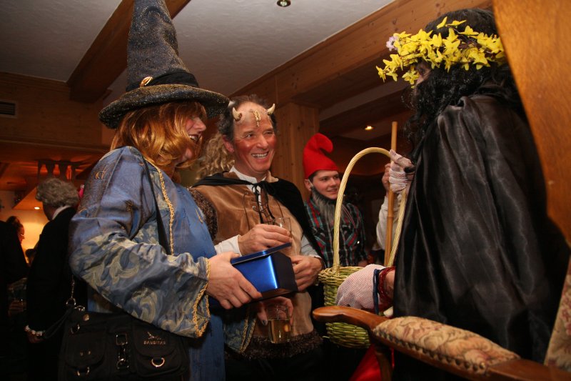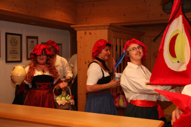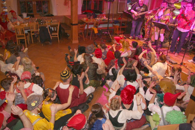 Der Fanfarenzug führte die Gesellschaft dann in den Saal, wo "Richard Wagner" sie auf die Plätze verteilte und Hochzeitssträußchen für die Gäste verteilt wurden. Nach einer Tanzrunde der "Zimseer" gaben die Gebrüder Grimm eine Einführung über den Sinn ihrer in Büchern gesammelten Märchen. Nun folgte schon der erste Höhepunkt des Abends: der Einzug des Hochzeitspaares mit Hungertanz. Anscheinend gab es Unstimmigkeiten zwischen den beiden und Schlawittchen beförderte den Frosch mit einem Tritt in den Hintern in einen tiefen Brunnen. Ein Aufschrei ging durch den Saal, aber zu aller Überraschung stieg sogleich König Ludwig II erhobenen Hauptes aus dem Brunnen empor. Erleichtert über diese glückliche Wendung folgte der "Brautwalzer" mit pfiffiger Choreografie und akrobatischen Hebefiguren, die von den Besuchern mit tosendem Applaus bedacht wurden. Die Stimmung im zum Bersten vollem Saal stieg bei Musik und bei Wein, bis wieder eine Schrecksekunde die Gesellschaft erfasste. Die Braut wurde von Alibaba und den vierzig Räubern gestohlen samt weiterer dreier Frauen. Nach zähen Verhandlungen mit dem Anführer, einigen Prüfungen und einem Liebesbeweis konnten dann aber alle wieder glücklich ausgelöst werden. Es wurde noch ausgiebig getanzt, der königliche Fanfaren- und Trommelzug schwenkte seine Fahnen, das Sternentalermädchen sammelte fleißig Taler ein, und an der mobilen Bar war der Andrang groß. Gegen Mitternacht wurde die prächtige Hochzeitstorte angeschnitten und an die Besucher verteilt. Die Gäste feierten ausgelassen bis weit in die Nacht - und wenn sie nicht gestorben sind, dann feiern sie noch heute.